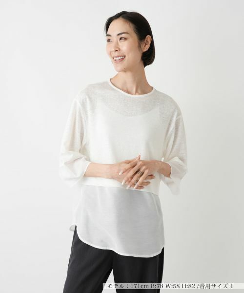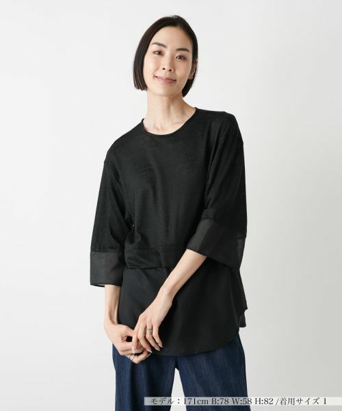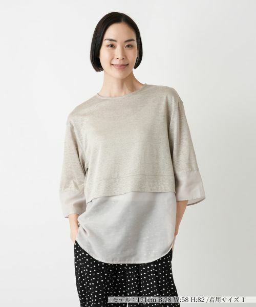 異素材を重ねた軽やかなレイヤード風デザインが魅力のカットソー。程よい透け感と異なる質感の切り替えが、シンプルながらも着こなしに奥行きをあたえてくれます。ドロップショルダーとゆったりしたシルエットが体のラインを拾いにくく、リラックスした着心地に。やや長めの丈感は気になる腰まわりをさりげなくカバーし、パンツにもスカートにも合わせやすいバランスです。一枚で着映えする、春夏のスタイリングに重宝するアイテムです。