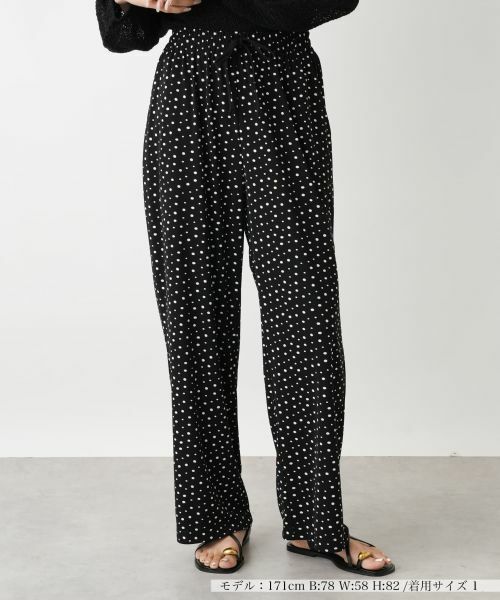 リズミカルなドット柄が装いに軽やかな遊び心を添える、リラクシーな一本。ウエストはゴム仕様で締め付け感が少なく、デイリーに活躍する快適なはき心地が魅力です。さらりとした素材感と落ち感のあるシルエットが、ラフさの中にも上品さを演出。モノトーンの配色なので、シンプルなトップスと合わせるだけで絵になるスタイリングが完成します。リゾートから街中まで、シーンを選ばず着まわせる大人の柄パンツです。