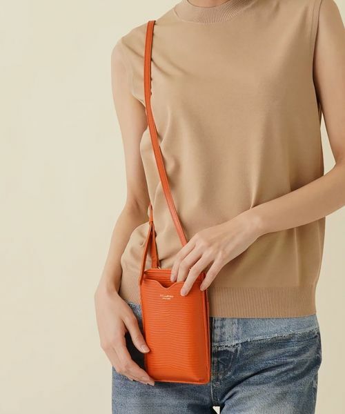 スマートフォン収納はもちろん、お財布としての機能も備えたミニショルダーバッグ。トカゲ風の型押しを施した、きめ細やかな質感の素材の艶やかな風合いが美しいデザインです。背面にはカードポケットも備わっており、便利なアイテムです。