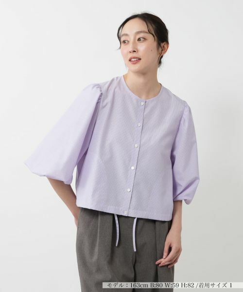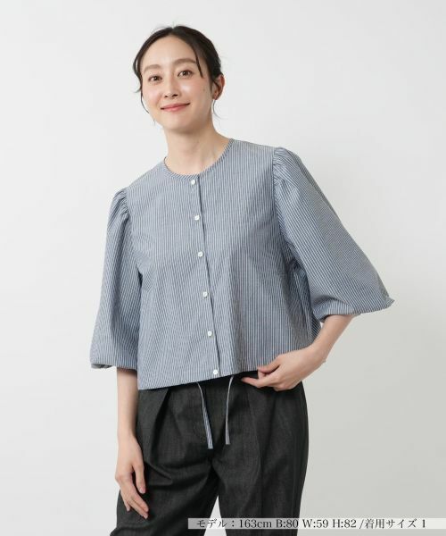 繊細なストライプ柄が上品な印象のノーカラーブラウス。軽やかな薄手素材で、暑い季節にもさらりと心地よく着用いただけます。程よくボリュームのあるスリーブが女性らしさを引き立て、クロップド丈で軽快な印象に。裾はコード入りで、シルエットの変化も楽しめます。パンツともスカートとも好相性で、オンにもオフにも活躍。ポケット付きで実用性にも配慮しました。