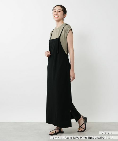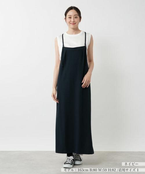 軽やかなコットン素材で仕立てた、キャミワンピース。すとんと落ちるIラインシルエットが、縦のラインを強調し、すっきりとした印象に。後ろウエストはゴム仕様で、快適な着心地とさりげないフィット感を両立しています。肩ひもは長さ調整が可能で、合わせるインナーに応じてバランスを変えられるのも魅力。Tシャツやブラウスとのレイヤードはもちろん、合わせるアイテム次第で季節を問わず着回せるアイテムです。