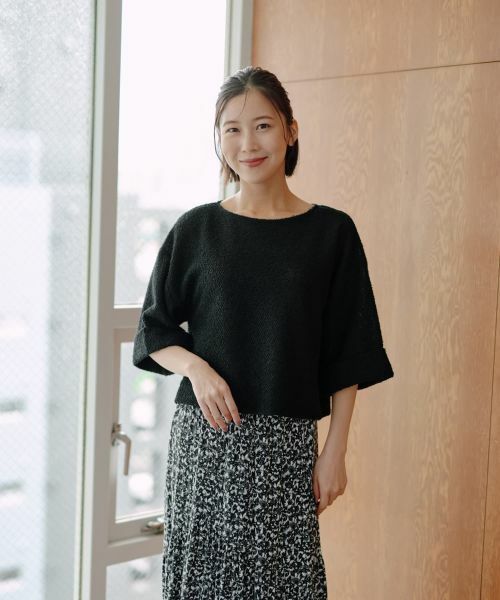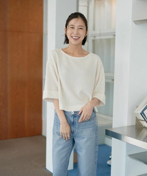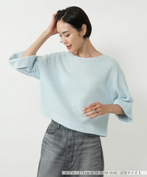 ざっくりとした凹凸感のある編地の風合いと、程よくゆとりのあるシルエットが目を惹くプルオーバー。コットン、ポリエステル、ナイロンをブレンドした、軽くふくらみのある独特の素材感が特徴。ワイドなスリーブラインと短めの着丈が、こなれたバランスを演出。袖口の折り返しデザインがさりげないアクセントに。シンプルなボトムスに合わせるだけで、存在感のある着こなしが叶うトップスです。