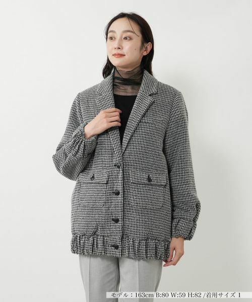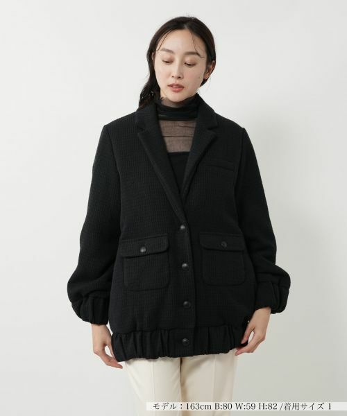 クラシカルなジャケットに、ブルゾンのディテールを掛け合わせた新鮮な一着。きちんと感のあるテーラードカラーと、裾と袖口のゴムギャザーが作り出すカジュアルな雰囲気が絶妙にマッチします。丸みのあるシルエットが女性らしさを引き立て、腰回りもナチュラルにカバー。大きなフラップポケットがデザインのアクセントになっています。スカートと合わせてフェミニンに、パンツと合わせてマニッシュにと、幅広い着こなしを楽しめるアウターです。
