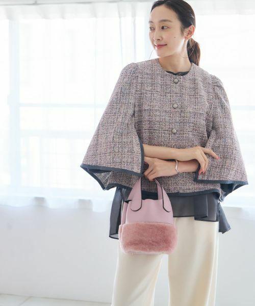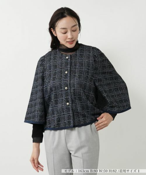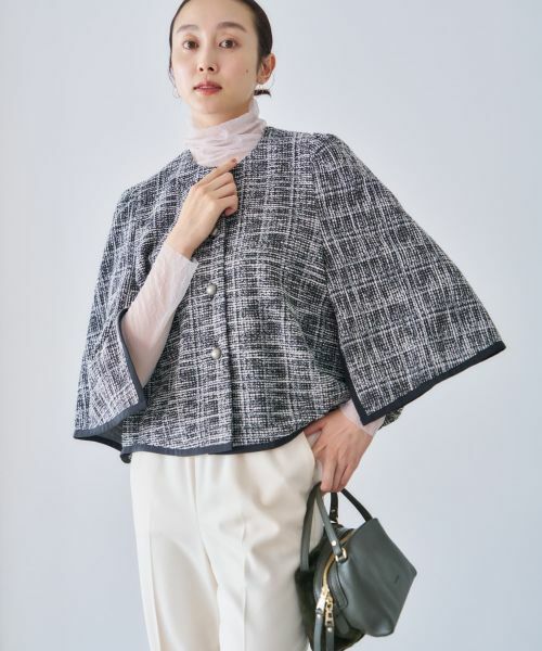 さっと羽織るだけで旬のクラシカルスタイルが完成する、ケープ風シルエットのジャケット。繊細なラメを織り込んだ生地が上品な華やかさを演出し、裾にあしらわれたパイピングが全体の印象を引き締めます。カーディガンのように軽やかに羽織れるやや薄手素材ながら、きちんと感もしっかりとキープ。すっきりとしたノーカラーはハイネックのトップスやブラウスとも好相性です。きれいめな着こなしはもちろん、デニムと合わせてカジュアルダウンするのもおすすめ。