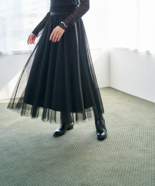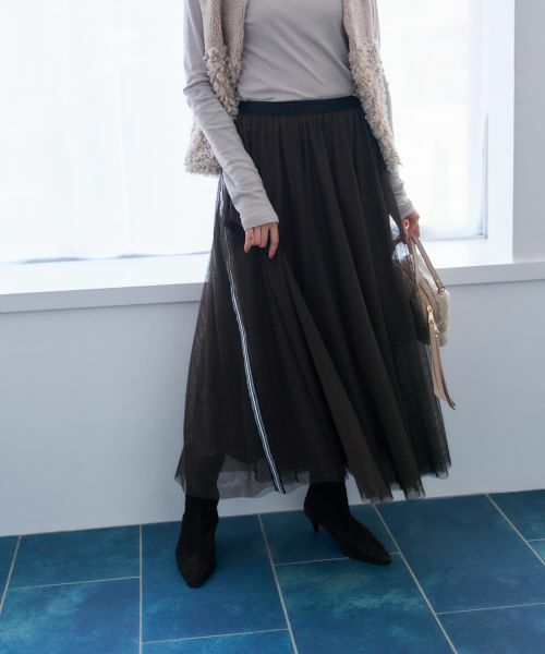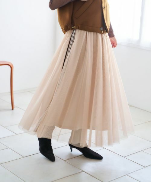 軽やかなチュール素材を贅沢に使用したロングスカート。歩くたびにふわりと揺れるシルエットが女性らしさを引き立てます。両サイドにはニットテープが施され、裾は断ち切り仕様にすることで、甘すぎない程よいカジュアル感をプラスしました。ウエストは総ゴム仕様でストレスフリーな穿き心地を実現しています。裏地付きなので透け感を気にせず着用でき、秋のコーディネートに軽やかさとトレンド感を添えるアイテムとなっています。