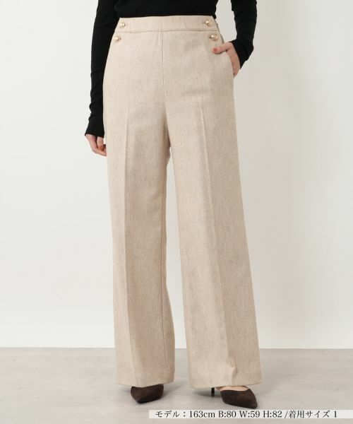 クラシカルなマリンディテールと、存在感のあるシルエットが魅力のワイドパンツ。ハイウエストのサイドにあしらわれた飾りボタンが、コーディネートに上品なアクセントをプラス。ウエスト位置を高く見せ、レッグラインを引き立てるセンタープレス入りのワイドストレートシルエットで抜群のスタイルアップ見せ効果を叶えます。フロントはすっきり見え、後ろウエストはゴム仕様になっているため、きちんと感とストレスフリーな穿き心地をキープ。オンオフ問わず、秋冬のコーディネートの主役になる一本です。サイドホック&ファスナーにより開閉が可能。
