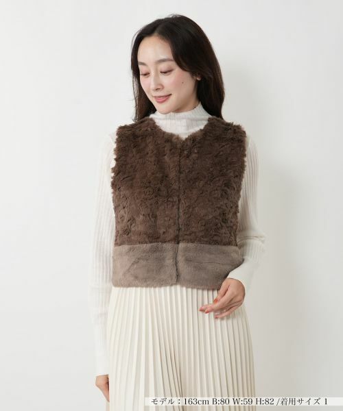 いつものコーディネートに重ねるだけで、季節感とトレンド感を高めてくれる、ボア切替デザインのショートベスト。前身頃には表情豊かなボア素材を、後ろ身頃にはすっきりとしたニット素材を使用。前から見ると華やか、後ろはすっきりという計算されたデザインでリッチな質感が楽しめます。スタイルアップ見せ効果が期待できるショート丈は、ワンピースやハイウエストのボトムスとも相性抜群。フロントはカギホックで留める仕様なので、きれいなシルエットをキープします。