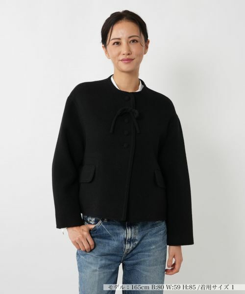 ネックラインにあしらわれたリボンが、顔周りをフェミニンに彩るノーカラージャケット。クラシカルなムードを演出する、くるみボタンも上品なアクセントに。やや短めの着丈とゆったりとしたボックスシルエットが、ボトムスともバランス良く決まり、さっと羽織るだけでこなれた印象に仕上がります。裏地のない一重仕立てながら、ふっくらとした厚手の生地で軽やかさと暖かさを両立。ワンピースやスカートと合わせたきれいめな着こなしはもちろん、パンツスタイルに甘さをプラスするのもおすすめです。