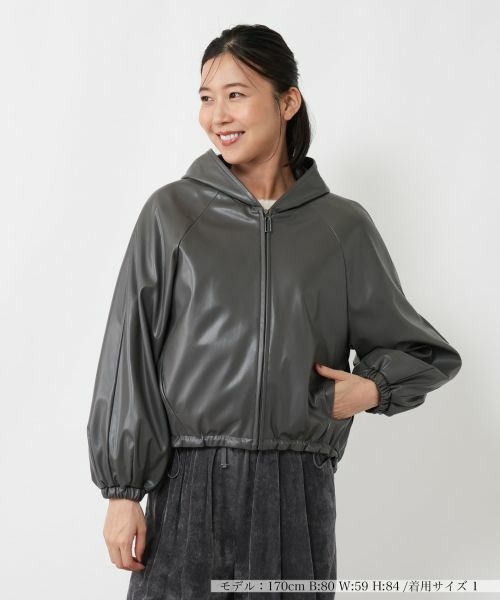 リアルレザーのような質感を持つ合皮で仕立てた、モードな雰囲気のフーデッドブルゾン。ラグランスリーブから続く、たっぷりとボリュームを持たせた袖が特徴。裾のドローコードを絞れば、丸みのあるコクーンシルエットへのアレンジも可能。エッジの効いたデザインで、いつものコーディネートを少しスパイシーに引き締めてくれる大人顔のアウターです。