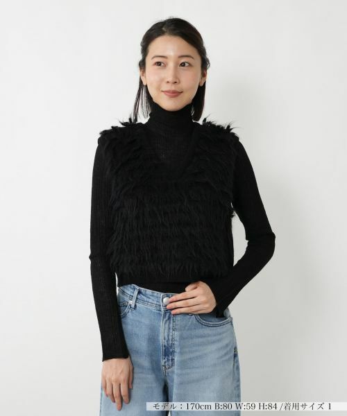 レイヤードスタイルに豊かな表情をプラスするショート丈のVネックニットベスト。前身頃に贅沢にあしらわれたフリンジ編みが特徴で、コーディネートに華やかさと温かみを添えます。後ろ身頃はシンプルな天竺編みに切り替え、すっきりとしたバックスタイルを実現。伸縮性のあるやや厚手のニット素材で快適な着心地が感じられます。シャツやタートルネック、ワンピースなど、様々なアイテムとの重ね着が楽しめる一着です。