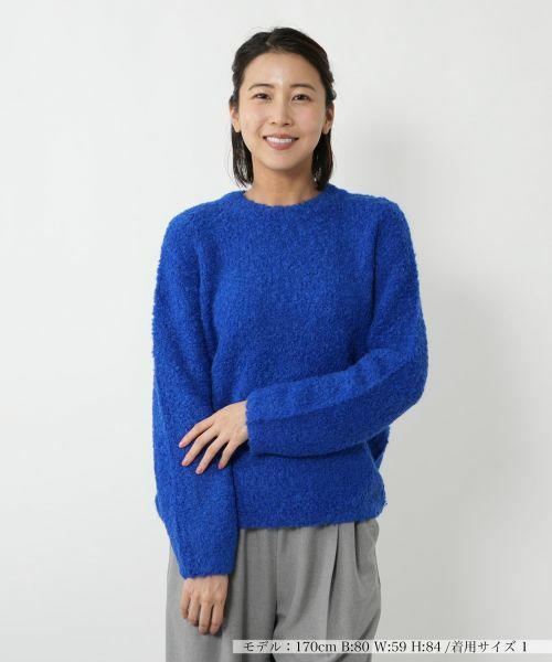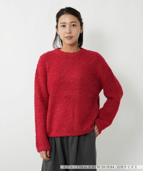 アルパカをブレンドした、ブークレー特有の表情が魅力のクルーネックニットプルオーバー。ループ状の糸が織りなす立体的な表面感がシーズンムードを演出。伸縮性のあるやや厚手の生地は、ざっくりとした編み立てにより程よい透け感があり、インナーとのレイヤードスタイルを軽やかに楽しめます。リラックス感のあるシルエットも相俟ってエフォートレスなムードをプラス。シンプルなボトムスと合わせるだけでも、コーディネートにあたたかみを与えてくれるアイテムです。