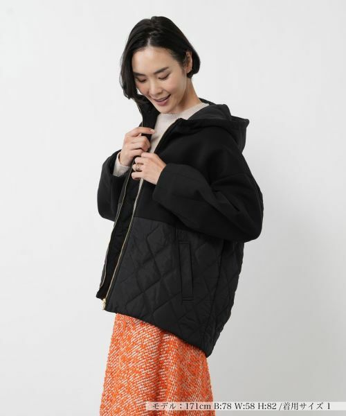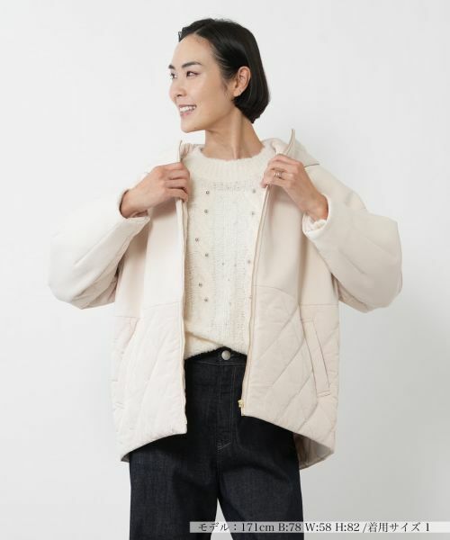 滑らかなタッチのジャージー素材と、中わた入りのダイヤキルティングをドッキングさせたジップアップ仕様のフーデッドショートコート。異素材のコントラストがワントーンの中に洗練された奥行きを演出します。さらにきらりと光るゴールドファスナーが、スポーティなデザインに大人の品格をプラス。暖かな中わた入りで、軽やかなショート丈はボリュームボトムスとも好相性。これからの季節のデイリールックをリッチに格上げしてくれるアウターです。