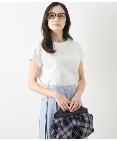 クルーネックのフレンチスリーブTシャツ。コーディネートに取り入れやすいシンプルなデザインで、1枚着はもちろんジャケットなどのインナーとしても重宝します。また、首元は見返し処理ですっきりとしているため、カジュアルになりすぎず上品な印象に着こなせます。スカート、パンツ共にバランスの取りやすい丈感もポイント。