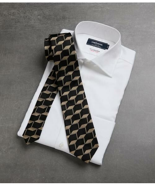 高級感のあるシックな色味と存在感のある大柄が印象的な幾何学柄ネクタイ。無地のスーツやジャケット・ブレザーに合わせやすく、コーディネートのアクセントになる1本です。■素材1871年創業のイタリア名門ファブリックメーカー「Fermo Fossati/フェルモ フォサッティ」社製の生地を使用した、シャリ感のあるシルク100%素材。また小剣裏部分には、同社の織りネームを装着しています。■カラーブラック1色展開。■シーズン2025年春夏商品