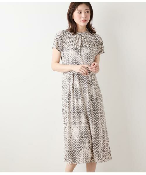 フレンチスリーブの膝下丈ワンピース。ウエスト切り替えの程よいフィット感と、裾に向かってしなやかに広がるフレアラインのメリハリが優美なシルエットを叶えます。やや立ち上がったコンパクトな襟元にあしらった、立体感のあるギャザーもポイント。裏地あり。ポケットなし。