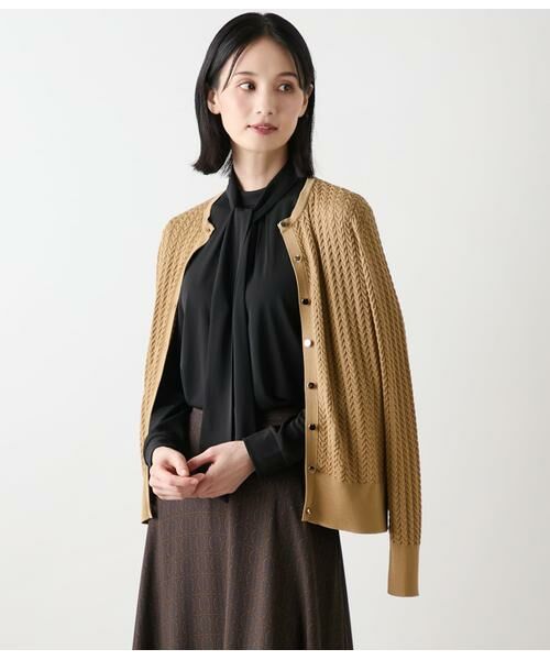 クルーネックの長袖カーディガン。ツイストの間隔が詰まった繊細なケーブル柄を全面に配し、表情豊かに仕上げました。フロントのメタル釦がツヤをプラスし、華やかな着こなしに。襟開きがコンパクトなため、1枚でプルオーバー風に着用いただくのもおすすめです。