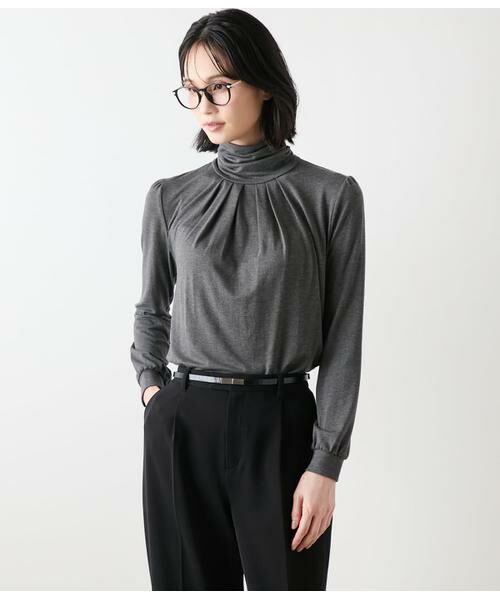 首元まであたたかく包み込む、タートルネックのカットソー。胸元にタック、裾にギャザーを入れてふんわりとさせることで、身体のラインを拾いにくいシルエットに仕上げました。胸元のタックは、ジャケットスタイルにも映える繊細なアクセントに。薄手ながらもあたたかく、着ぶくれを気にせずに冬のレイヤードスタイルをお楽しみいただけます。タートルネック部分は外側に折り込んでも、ゆとりを残して折らずに着用してもバランス良く決まります。