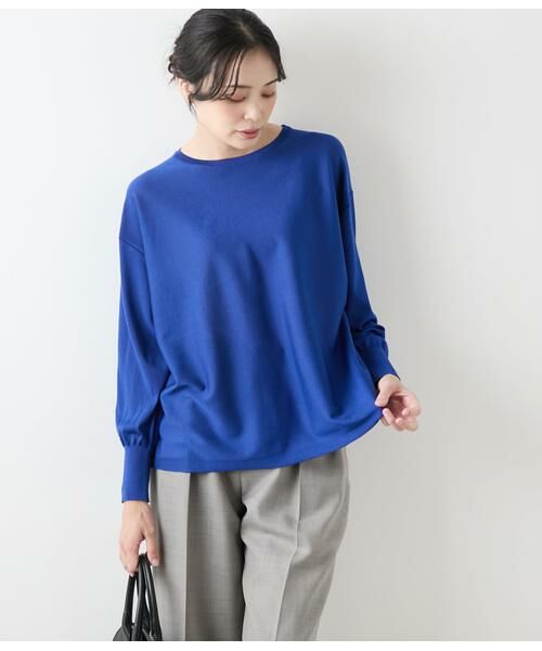 ゆったりとしたシルエットに、裾のフレアラインを取り入れることで自然な揺らぎを表現。パンツにもスカートにも合わせやすく、幅広いスタイリングに対応します。また、袖口には編み柄をあしらい、パフデザインでさりげない立体感をプラスしました。袖をブラウジングして、こなれた雰囲気で着用するのがおすすめ。