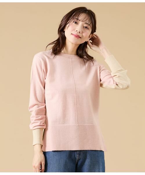 前後で切り替えた優しい配色が、春のスタイリングにほどよい軽さと華やぎを添えるニットプルオーバー。すっきり見えの縦ラインとリラックス感のあるシルエットで、オフィスカジュアルからお出かけまでデイリーに頼れる1枚です。顔色をふわっと明るく見せる好印象なピンク×ベージュ、清潔感のある爽やかさが好印象なライトグリーン×ベージュ、大人のきれいめカジュアルに馴染む都会的なサックス×ライトグレーの3色展開。