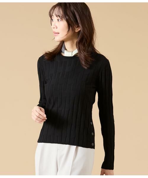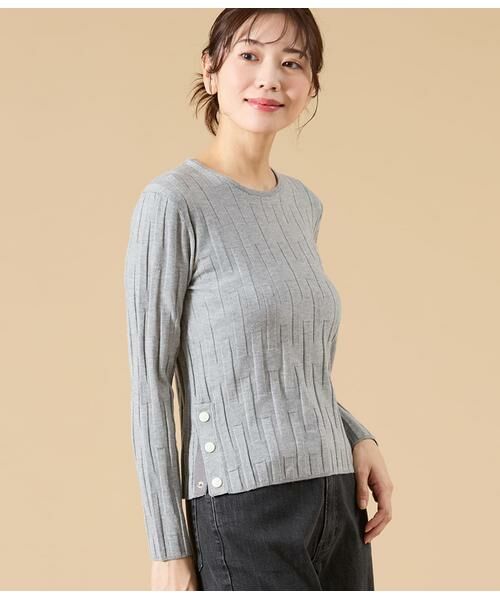 リブをアレンジした凹凸のある編地がポイントのプルオーバー。着ぶくれしないすっきりシルエットでジャケットインにもおすすめ。両脇裾のドットボタンで開き具合を調整でき、タックインせずとも抜け感のある着こなしも楽しめます。