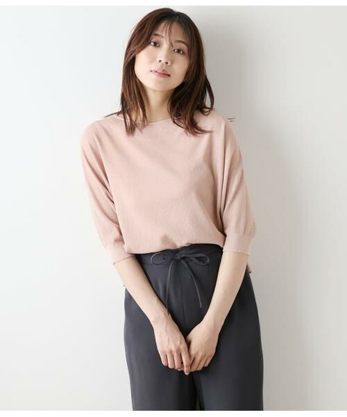 クルーネックの7分袖プルオーバー。前身頃と袖は凹凸感のある鹿の子編み、後ろ身頃は天竺編みに切り替え、ニットならではのさりげないデザイン性をプラスしました。ゆったりとしていながら、膨らみが少なくすっきりお召しいただけます。サイドにはスリットを入れ、後ろの丈をやや長くすることで、腰周りやヒップを自然にカバーしています。