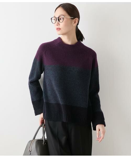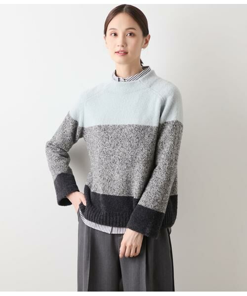単色糸と3色を撚り合わせたミックス糸を組み合わせた、こだわりの配色切替デザイン。くっきりとしながらも自然な色のつながりで、上品な印象に仕上げています。襟元は編み続きのビルドネックで、リブを使わずすっきりと。また、裾をベーシックなカラーでまとめているため、ボトムを選ばずコーディネートしやすいのも魅力です。