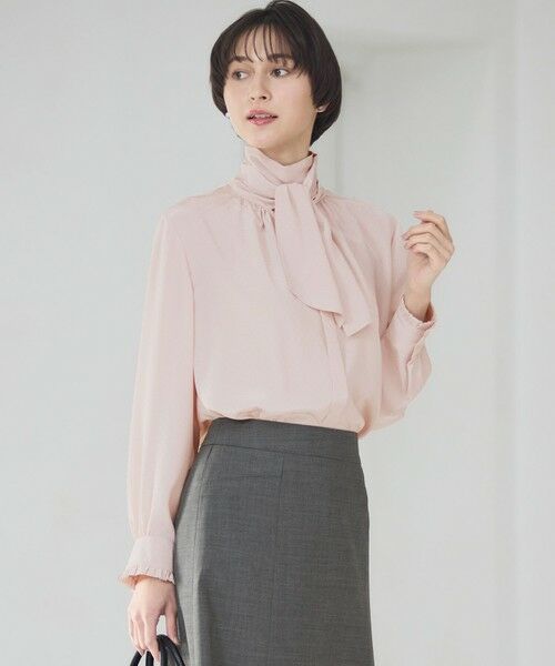さりげないドット模様がポイントになった、女性らしく華やかなブラウスです。ギャザーをたっぷりとあしらったボリュームスリーブが手元を華奢に美しく魅せ、エレガントな雰囲気を演出します。一枚で主役になる存在感がありながらも、どんなボトムスとも好相性。シンプルなパンツやスカートと合わせるだけで、洗練されたコーディネートが完成します。デイリー使いはもちろんのこと、ビジネスシーン、さらにはお子様の学校行事、七五三、お食事会などのセレモニーシーンまで、幅広いオケージョンで活躍。ジャケットいらずでも華やかな印象を叶え、着る人の品格を引き立ててくれる頼れる一枚です。 カラーは清潔感溢れるホワイト(#001)、顔色を明るく見せる優美な新色のピンク(#012)、爽やかで知的な印象を与えるサックスブルー(#073)、優しい色合いのベージュ(#033)の4色展開です。