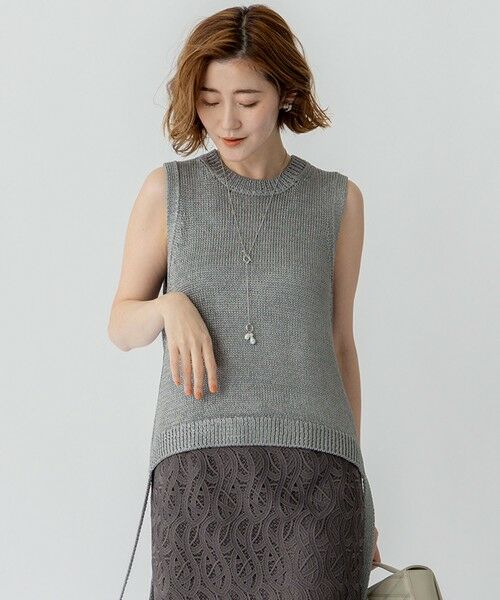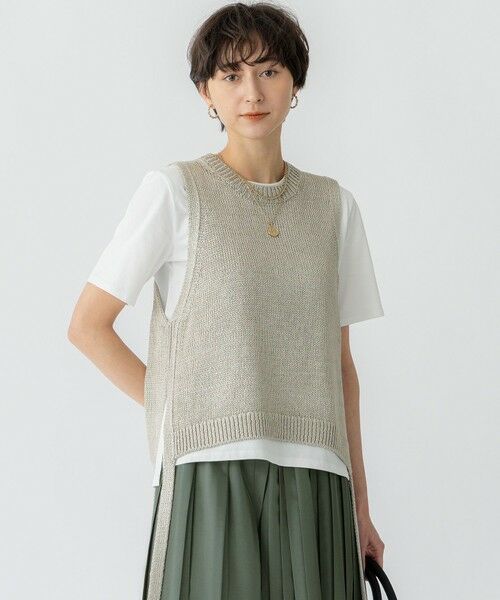 存在感のあるイタリア素材のリリヤーンで編み立てたクルーネックのニットベスト。脇には同素材の総針テープでアクセントに付けてスリットを開けてニュアンスを出しています。シャツやカットソーの上に合わせるだけで、存在感のあるアイテムです。カラーは、ニュアンス感のあるグレー(#004)、落ち着いた雰囲気のベージュ(#033)、印象的なライトグリーン(#962)の3色展開です。