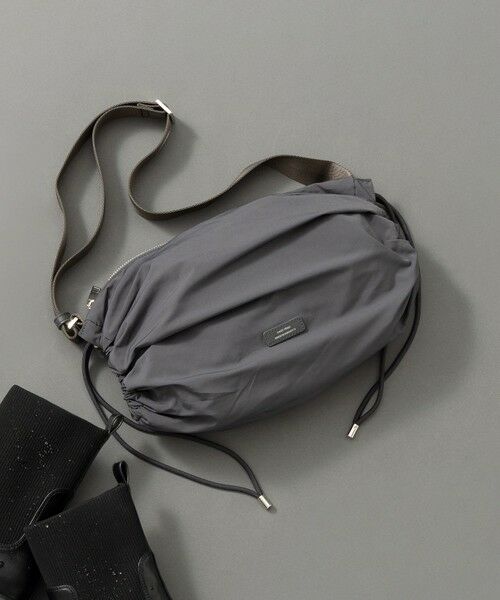両サイドがギャザー仕様になっているため、ギャザー部分を伸ばしたり絞ったりすることで、サイズとデザインを変えてご使用いただけるショルダーバッグです。両サイドを絞って丸みを出してコンパクトにしたり、荷物が多くなったときは両サイドを伸ばして内容量を増やしたり、片側だけ絞り、斜め掛けのナップサック風としてお使いいただけるようになっています。撥水加工を施しているので、雨の日でも安心してお使いいただけます。カラーはカジュアルなスタイリングと相性抜群のブラック(#005)、なじみの良いベージュ(#033)、WEB限定カラーのグレー(#004)、イエロー(#040)、スカイブルー(#072)の5色展開です。
