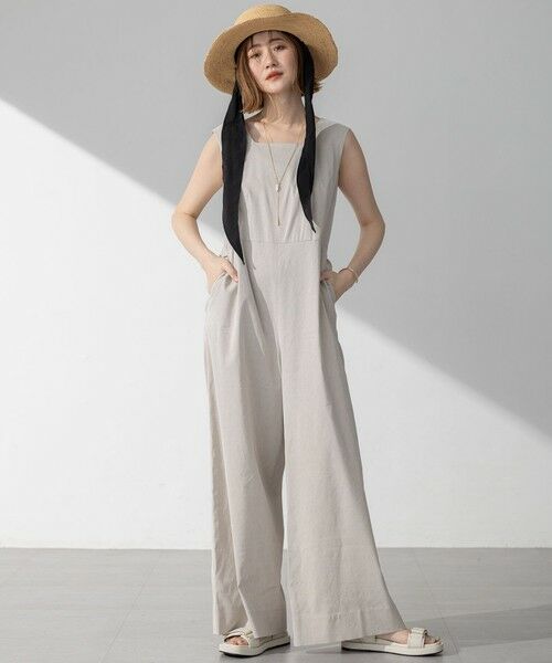 【洗える】リネンレーヨンストレッチ スクエアネック オールインワン