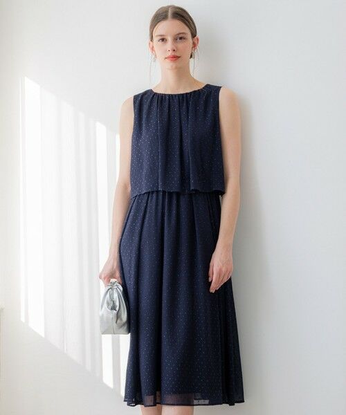 キラりと煌めくドット柄が全面に鏤められたノースリーブドレス。小さめのドット柄で派手になりすぎず華やかな雰囲気です。軽やかな素材感を生かし、贅沢に分量を多めにとることで存在感のある仕上がりです。トップス部分を降らしているデザインにすることで、すっきりとしたシルエットを演出します。清楚な雰囲気が漂う深みのあるネイビー(#075)、大人の魅力を引きたてるシックなブラック(#075)の2色展開です。