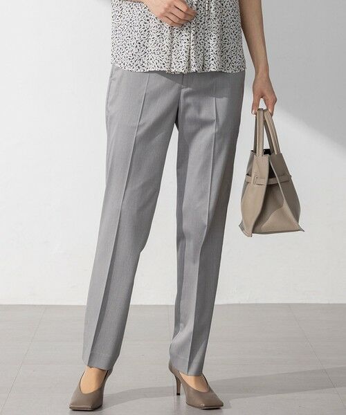 1本あると大活躍のスタイリッシュなテーパードパンツ。どんなトップスにも合わせやすく、オフィスでもデイリーにも万能に活躍できるアイテムです。ウエストの後ろにはゴムで伸縮性を持たせ、ストレスのない穿き心地に。同シリーズのジャケットときれいめセットアップで着たり、単品使いでブラウスと合わせても着られる、着回し力抜群のパンツです。カラーは、あか抜けた印象のライトグレー(#003)、きちんと感が増すネイビー(#075)の2色展開です。
