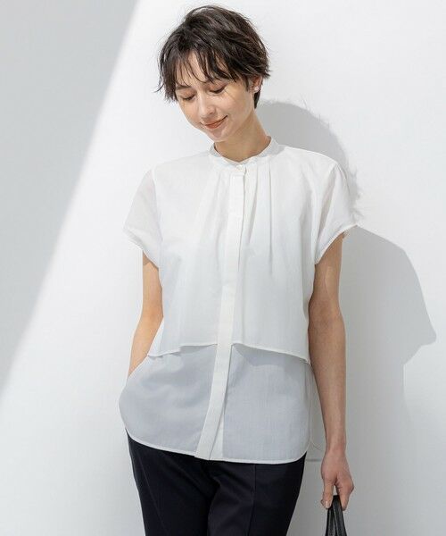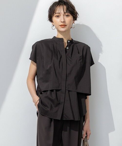 レイヤードデザインの華やかなブラウスです。バックスタイルにもフレア仕様が続いており、360°何処から見ても美しいシルエットで、華やかな印象を与えてくれます。袖は二の腕をキレイに魅せてくれる丈感になっています。パンツと合わせたスタイリッシュな着こなしがおすすめです。カラーは爽やかな印象のホワイト(#001)、抜け感のあるダークブラウン(#035)、モードな雰囲気のブラック(#005)、差し色にもおすすめなラベンダー(083)4色展開です。