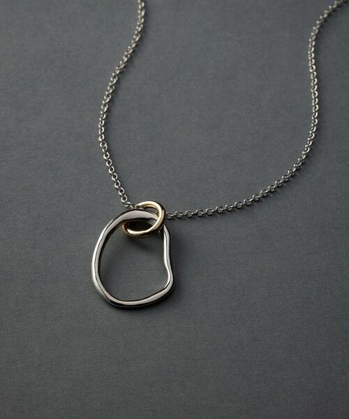 抑揚のあるラインのリングと、ゴールドの小リングがついたネックレスです。小リングのゴールドがアクセントになり、コーディネートに映えます。ネックレスとしてはもちろん、グラスホルダーとしてメガネやサングラスをかけてスタイリングしていただくこともできます。長さは3パターンでご調整いただけ、気分に合わせてアレンジして楽しめます。