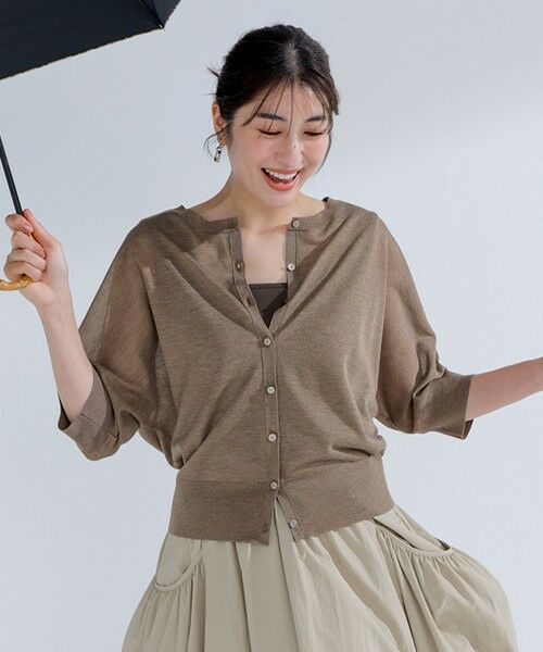 アームの締め付けのない、ドルマンスリーブの5分袖カーディガン。二の腕をカバーしつつ、上品な透け感のある素材で涼し気な印象です。襟はクルーネックで前後着用できるようにしています。裾のリブが腰で止まるような作りなので、コンパクトなプルオーバー風に着るのがおすすめです。カラーは、抜け感のあるアイボリー(#003)、ベーシックなブラック(#005)、ナチュラルな印象のブラウン(#030)、こなれ感のあるダークグリーン(#065)の4色展開です。
