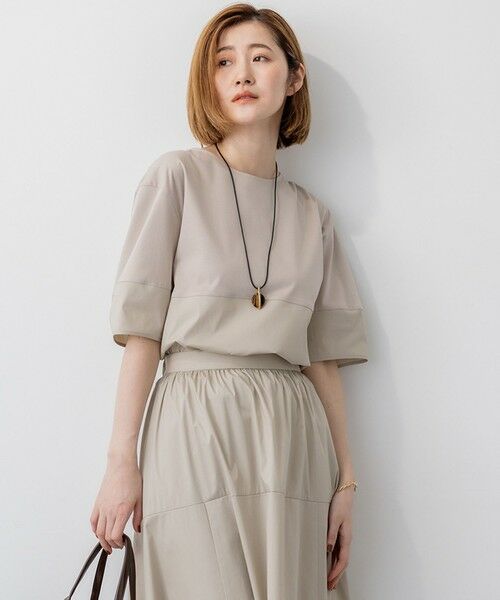 シンプルなTシャツデザインに、袖と裾の布帛切り替えがアクセントになったトップス。一枚で着るだけ洒落感をプラスするデザイン性のあるアイテムです。後ろ身頃のフレア切り替えがふんわりと膨らみ、存在感のあるバックスタイルを演出します。ヒップにかかる長めの後ろ丈は、気になる腰回りをさりげなくカバーしてくれるのも嬉しいポイント。パンツともスカートとも好相性で、カジュアルながらも上品な着こなしが楽しめます。カラーはニュアンス感のあるモスグリーン(#053)、やわらかな雰囲気のベージュ(#033)、印象の引き締まるブラック(#005)の3色展開です。