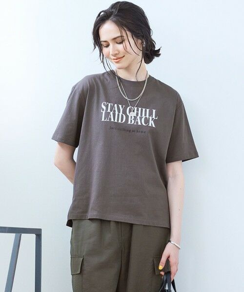ベーシックなクルーネックのロゴTシャツ。裾にスリットが入っているのでボトムにインして着こなしやすいデザインです。SLOWらしいゆったりリラックスした様子を示す英文ロゴをプリントしています。2段のロゴが重なった部分は、STAY CHILL(くつろいでね)、LAID BACK(のんびりした)、下の小さいロゴは箔プリントでjust chilling at home(家でくつろいでるよ)、という意味のロゴです。オフホワイトxダークパープルロゴ(#001)、ラベンダーxオフホワイトロゴ(#082)、カーキxスレートロゴ(#054)、スレートxオフホワイトロゴ(#004)のオシャレな配色の4色展開です。