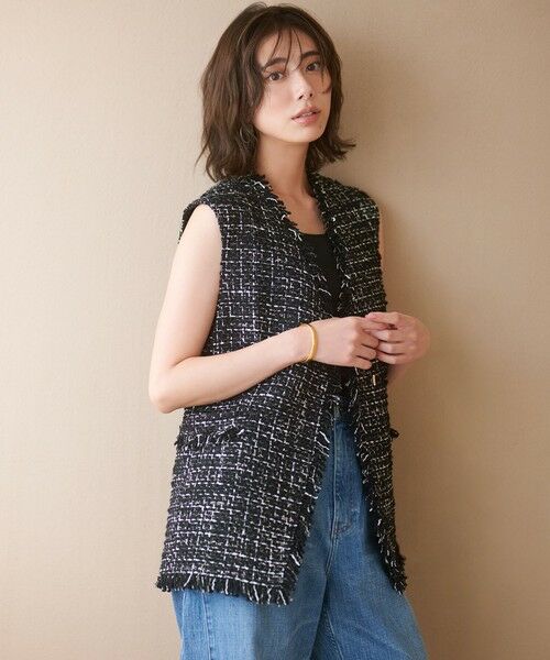 一点投入するだけで秋のムードを高めてくれるツイードジレ。イタリアの「GIOLICA」社のインポート素材を使用しています。ラフなフリンジがこなれ感をプラスしてくれ、羽織るだけでトレンド感たっぷりのスタイリングがかないます。首元はすっきりとしたVネックに仕上げているので、キレイめな着こなしはもちろん、Tシャツやデニムと合わせたカジュアルスタイルにも◎。カラーは、上品で華やかなアイボリーミックス(#302)と、シックで落ち着いたモノトーンミックス(#305)の2色展開です。