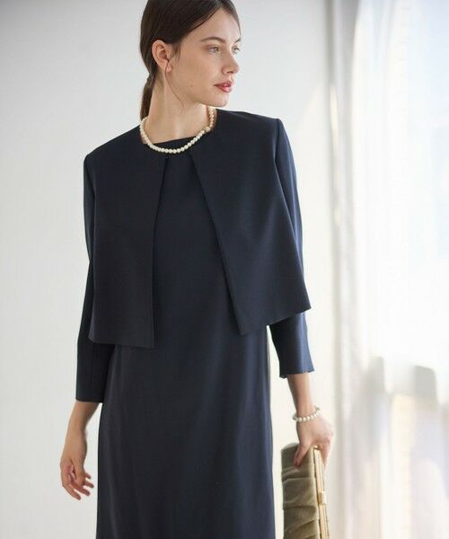 センターバックにタックを入れ、ややボリュームをもたせたノーカラージャケット。ドレスと合わせてバランスのよい、広がりすぎない分量感とレングスにこだわり、体のラインを程よくカバーしながら、きちんと見えするすっきりとしたデザインです。袖口にさりげなくスリットを入れることで、袖デザインのあるドレスとも相性がよく、着心地よく仕立てています。華やかなシーンにはもちろん、お仕事、学校行事などにも着回しの効くデザインです。シックな魅力を引き立てるブラック系(#005)と清楚な雰囲気の濃いめのネイビー系(#075)の2色展開です。