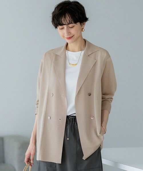 綿ポリエステルを表側に、透明糸を裏側に合わせた天竺編みのダブルボタンのニットジャケット。程よい透け感とハリ感が特徴で、羽織るだけで洗練された印象に。前立て部分は総針編みで、襟元がきれいに返るように仕立てられています。大きすぎない身幅でありながら、前身頃の絶妙な分量感が大人っぽさを演出。冷房対策としてはもちろん、暑い夏を快適に乗り切るアイテムとしても活躍します。シワになりにくく、ご自宅で手洗い可能なイージーケアも嬉しいポイントです。きれいめパンツと合わせてオフィスシーンに、デニムと合わせてカジュアルダウンするなど、幅広いスタイリングをお楽しみいただけます。カラーは印象引き締まるブラック(#005)、抜け感を演出するベージュ(#033)、洗練された印象のネイビー(#075)の3色展開です。