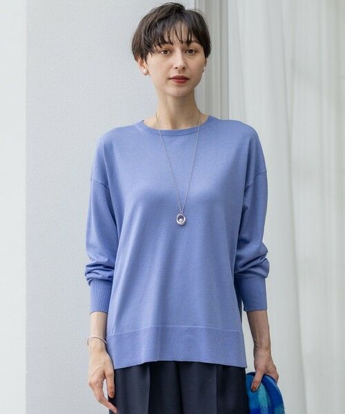 繊細なラメの光沢感が秋のムードを高めるニット。ややゆったりとしたサイズ感で、脇裾にグログランテープを使ったスリットがアクセントになっています。ヒップにかかる丈なので、気になる部分をカバーしつつ、ウエストインしても薄手のためごわつきません。スリットを活かして、アウトで着用する際もすっきりと決まります。カジュアルからきれいめまで幅広いスタイルにマッチし、一枚で着てもレイヤードスタイルでも様になる、着回し力抜群のアイテムです。秋のスタイリングに映えるカラー展開で、深みのあるグレー(#004)、印象引き締まるブラック(#005)、パッと目を引くオレンジ(#020)、やわらかな印象のベージュ(#033)、洒落感をプラスするサックスブルー(#073)の5色展開です。