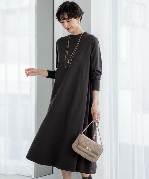 フロントはシンプルですっきりした印象、後ろ身頃に別布を使用したニットワンピース。少し立ち上がりのある襟元で、顔まわりをすっきりと見せ、アクセサリーも合わせやすく仕上げています。目の詰まった編地がボディーラインを拾わずきれいなシルエットを保ちます。後ろ身頃はヨーク切り替えで高い位置からギャザーを入れ分量感をもたせています。軽量な生地なので重くなく、動きに合わせて程よく広がるデザインです。カラーは、洒落感のあるブラウン(#054)、品の良さを演出するネイビー(#075)、シックな雰囲気のブラック(#005)の3色展開です。