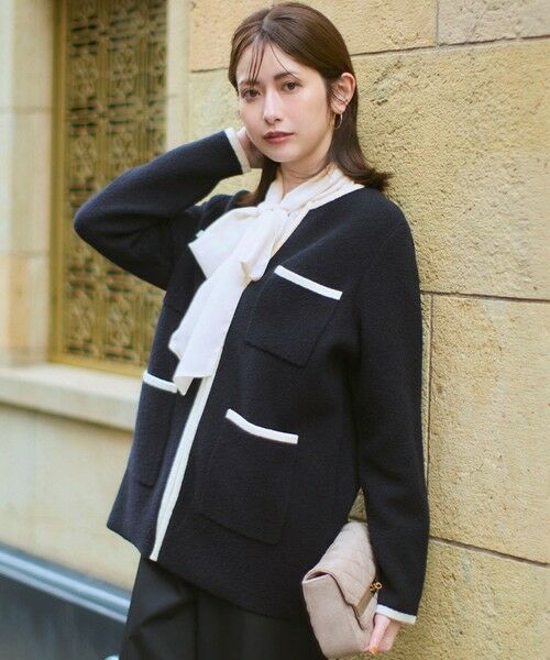 接結編み(2枚の生地を一枚の布のように編み合わせる編み方)で仕立てたクルーネックのニットアウター。前立て、襟、袖口に施された配色がデザインのポイント。ゴールドカラーの金属ファスナーがアクセントになり、上品さを引き立てます。秋口の早い時期から羽織りとして活躍し、Tシャツなどと合わせて着てもサマになります。また、コートを着る時期にはインナーとしても着やすいサイズ感なので、ロングシーズンお使いいただけます。様々なシーンで活躍する、ワードローブに加えるべき一着です。カラーはやわらかな印象のアイボリー×ブラック(#102)、品の良いブラック×ベージュ(#105)の2色展開です。