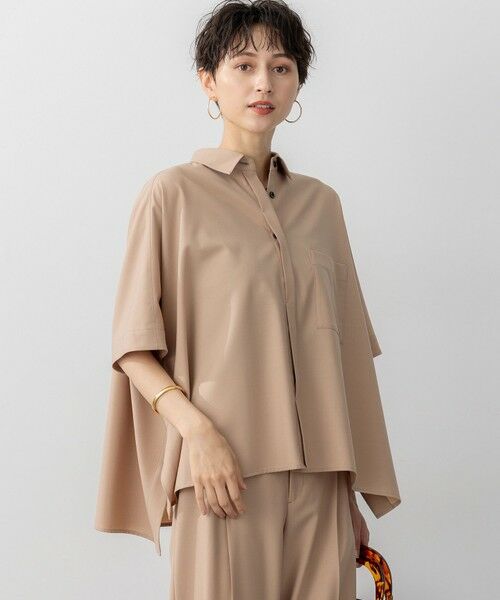 ポンチョシルエットのワイドシャツは、秋口には1枚着や軽い羽織アイテムとして、肌寒くなってからはタートルネックのカットソーやニットをレイヤードすることで、秋口から冬、春先まで長く着回せるアイテム。同素材のボトムスと合わせたキレイめセットアップスタイルや、デニムとのカジュアルなスタイリングまで幅広く着こなして頂けます。カラーは、上品でクラシカルなキャメル(#034)、こなれた印象のチャコール(#004)の2色展開です。