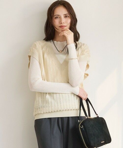 透け感のあるシアー素材のジレです。深めのVネックとゆとりのあるサイズ感で、リラックスした着心地を楽しめます。残暑の厳しい時期にはノースリーブやカットソーと、秋にはシアーなタートルネックと重ねて、レイヤードスタイルを幅広く楽しめます。腰にかかる長めのリブは、ヒップ上で少しブラウジングさせると、大人の抜け感を演出できます。カラーは合わせやすいブラック(#005)と、やや黄味のあるアイボリー(#002)の2色展開です。