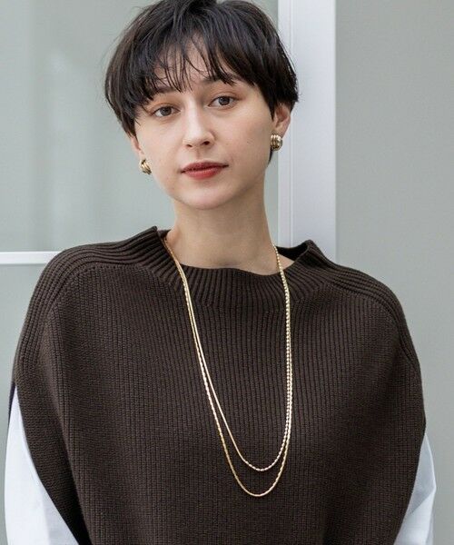 異なる2種類のチェーンが絶妙に組み合わさった、レイヤード風デザインのチェーンコンビネックレスです。細身ながらそれぞれ表情の異なるチェーンが、シンプルながらもスタイリングに奥行きをプラスします。ゴールドの輝きが肌なじみよく、華やかさをプラスしてくれる優秀アイテムです。アジャスター付きで長さ調整も可能なので、様々なトップスとの相性も抜群です。
