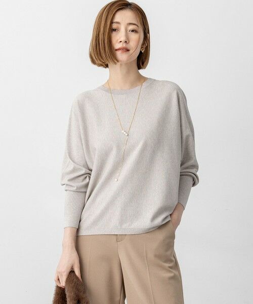 毎年ご好評いただいている定番のドルマンスリーブプルオーバーに、繊細なラメをプラスし、より華やかな印象にアップデートしました。前後差のあるデザインは、襟元を少し後ろに抜いて着用いただくことで、こなれ感と柔らかな雰囲気を演出します。袖口にあしらわれた長めのリブと、さりげないスリット開きが女性らしさを引き立て、手元まで美しく見せてくれます。ボディラインを拾わないゆったりとしたシルエットながらも、優雅なドレープが上品さを醸し出し、パンツにもスカートにも合わせやすい着回し力の高さも魅力です。一枚で着映えが叶い、オンオフ問わず様々なシーンで活躍する、大人の女性にぴったりの一枚です。カラーは、やさしい雰囲気のブラウン(#030)、淡い色合いが大人っぽいベージュ(#033)、ラメ感が際立つピーコックグリーン(#061)の3色展開です。