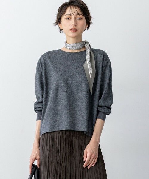 ウエストに切り替えを入れ、立体的で動きのあるシルエットがポイントのプルオーバー。身頃はゆったりとしたボリュームがありながらも、ウエスト周りをコンパクトにすることで、バランス良く一枚でサマになるデザインに仕上げました。気になるボディラインをカバーしつつ、スタイルアップ効果も期待できます。袖口は柔らかい編立リブ使いで、たくし上げても優しくフィットし、手元をすっきりと見せてくれます。アクセサリーや小物で表情を変えれば、様々なシーンで活躍する万能アイテムです。カラーは、程よく抜け感のあるグレー(#004)、印象引き締まるブラック(#005)、ニュアンス感をプラスするカーキ(#054)の3色展開です。