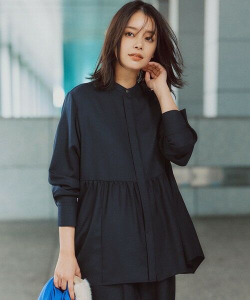 裾のイレギュラーヘムがポイントのデザインブラウスです。腰回りをカバーしてくれる長めのレングスなので、細身のパンツを合わせていただくとメリハリのあるスタイリングが叶います。また、同素材のワイドパンツやデニムのワイドパンツと合わせても今年らしいボリューム感のあるスタイリングをお楽しみいただけます。カラーは、こなれた印象のグレー(#004)と、品の良さを引き立てるネイビー(#075)の2色展開です。