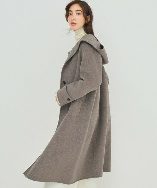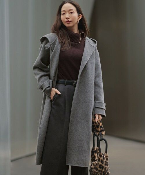 さっと気負いなく羽織れる、フード型ロングコート。フロントをあけて着ると、ゆとりのあるシルエットがリラックスした大人の女性らしいムードに。フード部分はタブで留められ、防寒対策もしっかりとしています。ゆったりした身幅と袖なので、中に着るインナーの厚みを気にせず着用いただけます。リバー仕立てなので軽量なのに暖かく着られる、万能NEWアウターです。カラーは柔らかく軽やかなオートミール(#033)、肌馴染みの良いモカ(#030)、こなれた印象のミディアムグレー(#004)、王道主力カラーのブラック(#005)の4色展開です。